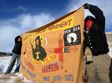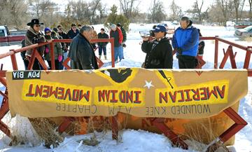 “Chief Little Wolf relatives, from left, John “Hector” Riley and Eliase Grey Wolf hold up an American Indian Movement during a ceremony honoring Cheyenne Chiefs Little Wolf, Dull Knife and Wild Hog at the Lame Deer cemetery Wednesday. Means met with local activist Tim Lame Woman as well as other tribal members. (LARRY MAYER/Gazette Staff) Banner reads: “Wounded Knee Chapter American Indian Movement.. Free Lenard Peltier.. Lakota Nation.. Wounded Knee 1980-1973”