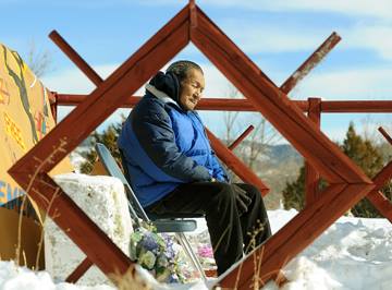 “Rock Red Cherries listens to a prayer as American Indian Movement founder Russell Means attends a ceremony honoring Cheyenne Chiefs Little Wolf, Dull Knife and Wild Hog at the Lame Deer cemetery Wednesday. Means met with local activist Tim Lame Woman as well as other tribal members. (LARRY MAYER/Gazette Staff)”