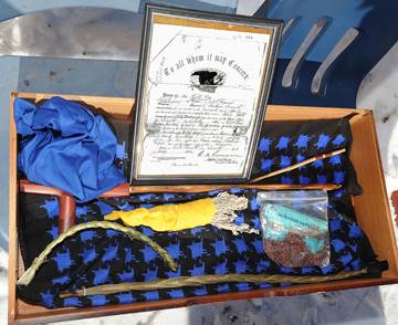 “A pipe belonging to Chief Little Wolf and Army discharge papers from Scout Wild Hog are among items on display as American Indian Movement founder Russell Means attends a ceremony honoring Cheyenne Chiefs Little Wolf, Dull Knife and Wild Hog at the Lame Deer cemetery Wednesday. Means met with local activist Tim Lame Woman as well as other tribal members. (LARRY MAYER/Gazette Staff)”