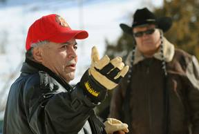“Tim Lame Woman delivers a speech as American Indian Movement founder Russell Means attends a ceremony honoring Cheyenne Chiefs Little Wolf, Dull Knife and Wild Hog at the Lame Deer cemetery Wednesday. Means met with local activist Lame Woman as well as other tribal members. (LARRY MAYER/Gazette Staff)”