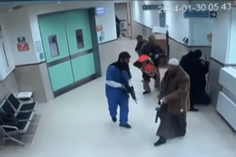 Security camera footage circulated online appeared to show about a dozen undercover personnel, including three in women’s clothing and two dressed as medical staff, pacing through a corridor of the hospital with assault rifles.